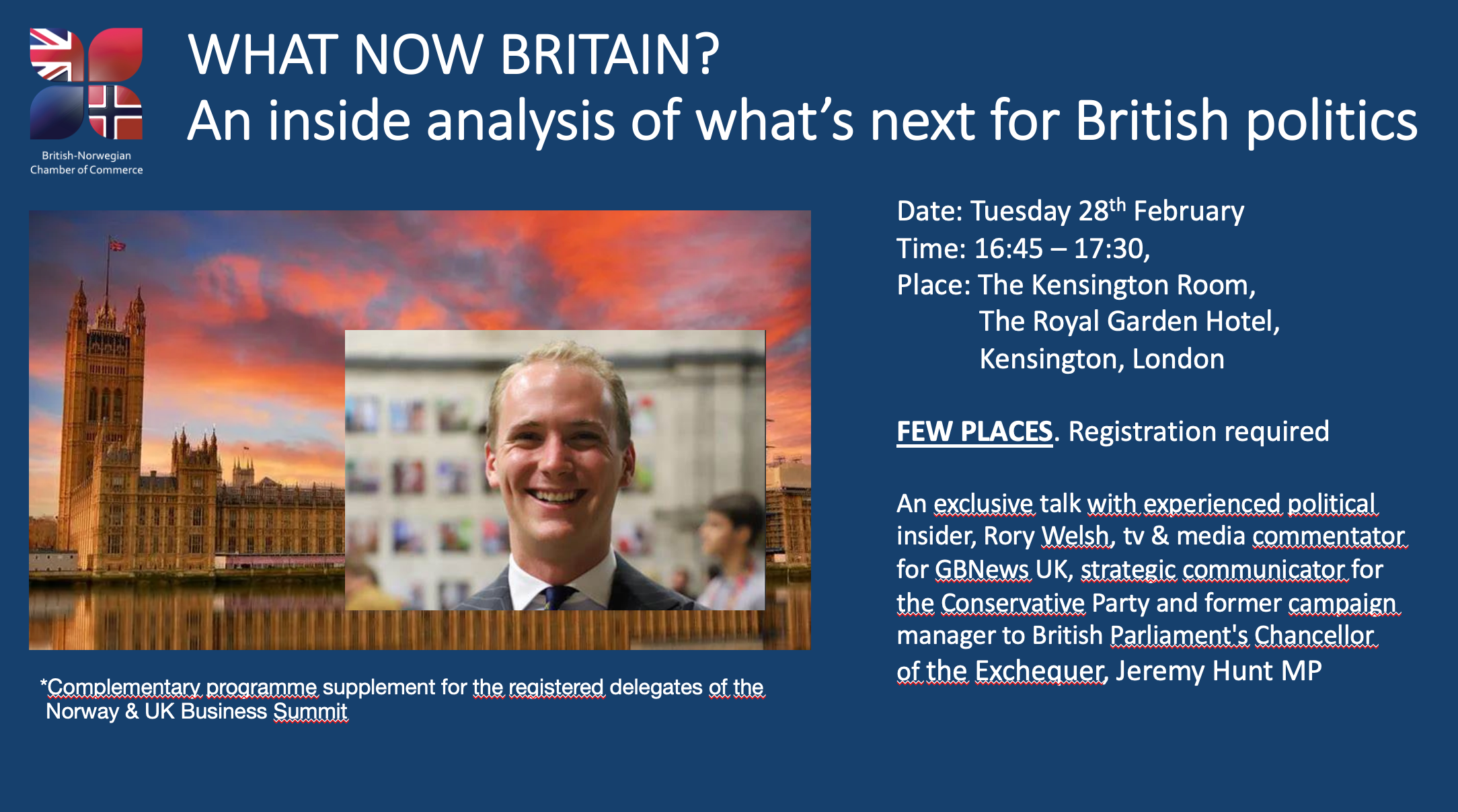 As an extra bonus for delegates of the Norway & UK Business Summit, the BNCC welcome you to an exclusive talk with experienced political insider, Rory Welsh, best known as tv and media political commentator for GBNews UK and former campaign manager to Chancellor of the Exchequer (Finansministeren) Jeremy Hunt MP, who will be sharing his behind-the-scenes, first hand views of the current movements within British politics.
